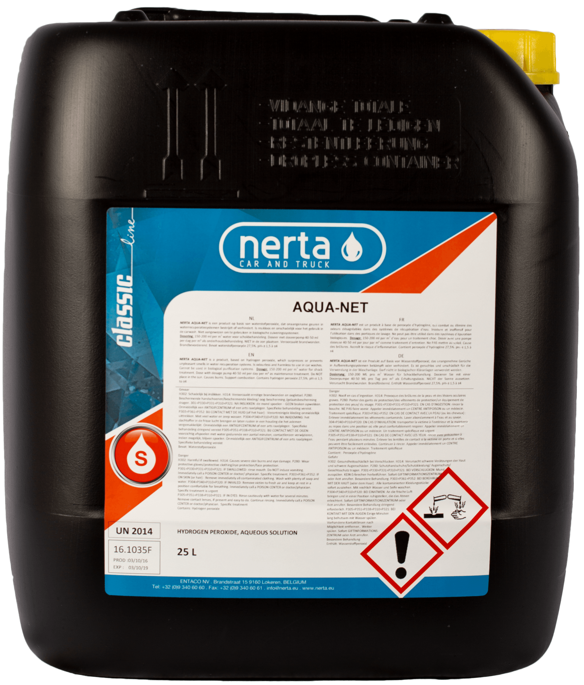 NERTA AQUA‐NET ist ein Produkt auf Basis von Wasserstoffperoxid, das unangenehme Gerüche in Aufbereitungssystemen bekämpft oder verhindert. Es ist geruchlos und unschädlich für die Verwendung in der Waschanlage. Darf nicht in biologischen Kläranlagen verwendet werden.