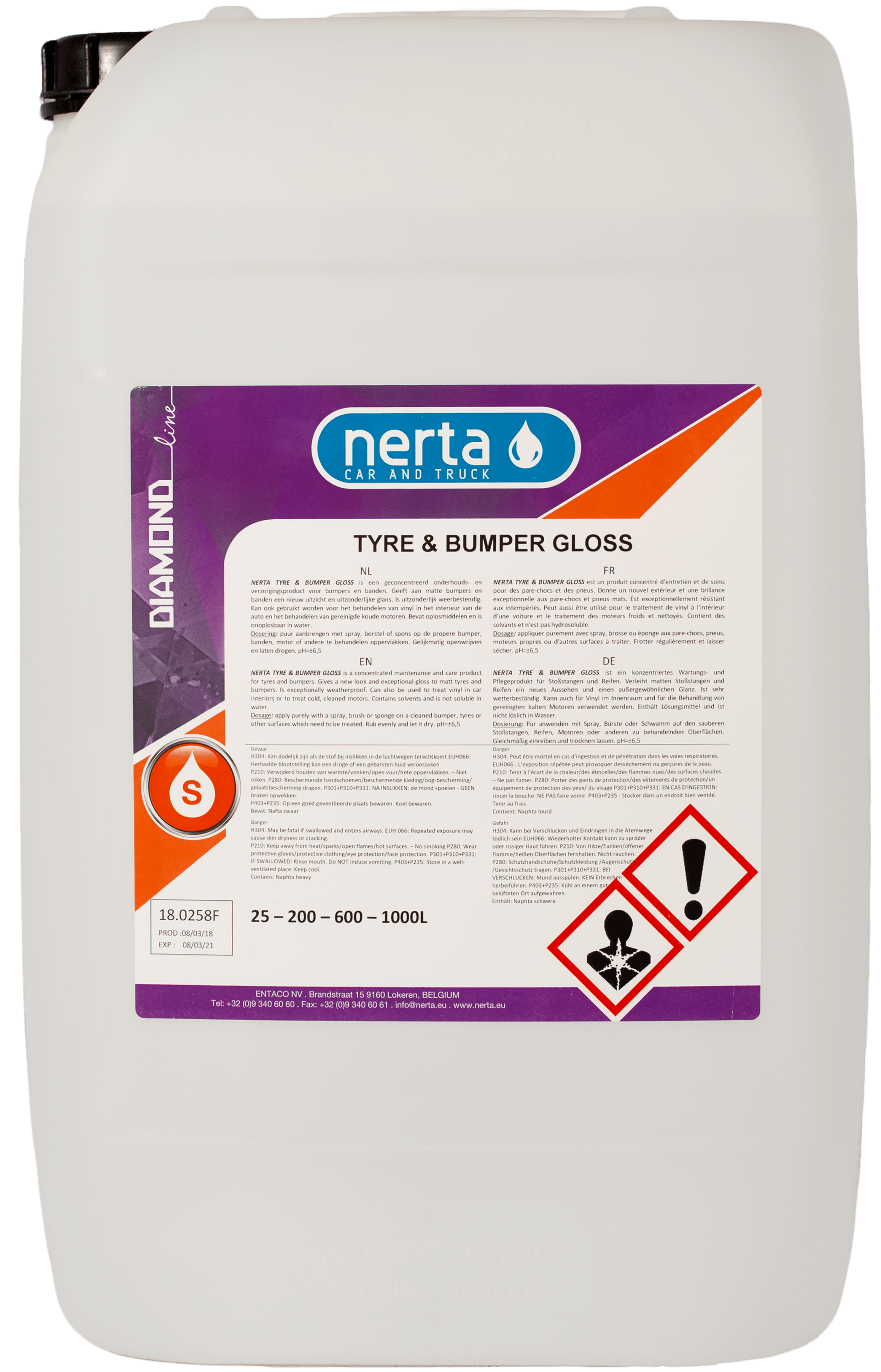 NERTA TYRE & BUMPER GLOSS ist ein konzentriertes Wartungs- und Pflegeprodukt für Stoßstangen und Reifen. Verleiht matten Stoßstangen und Reifen ein neues Aussehen und einen außergewöhnlichen Glanz. Ist sehr wetterbeständig. Kann auch für Vinyl im Innenraum und für die Behandlung von gereinigten kalten Motoren verwendet werden. Enthält Lösungsmittel und ist nicht löslich in Wasser.