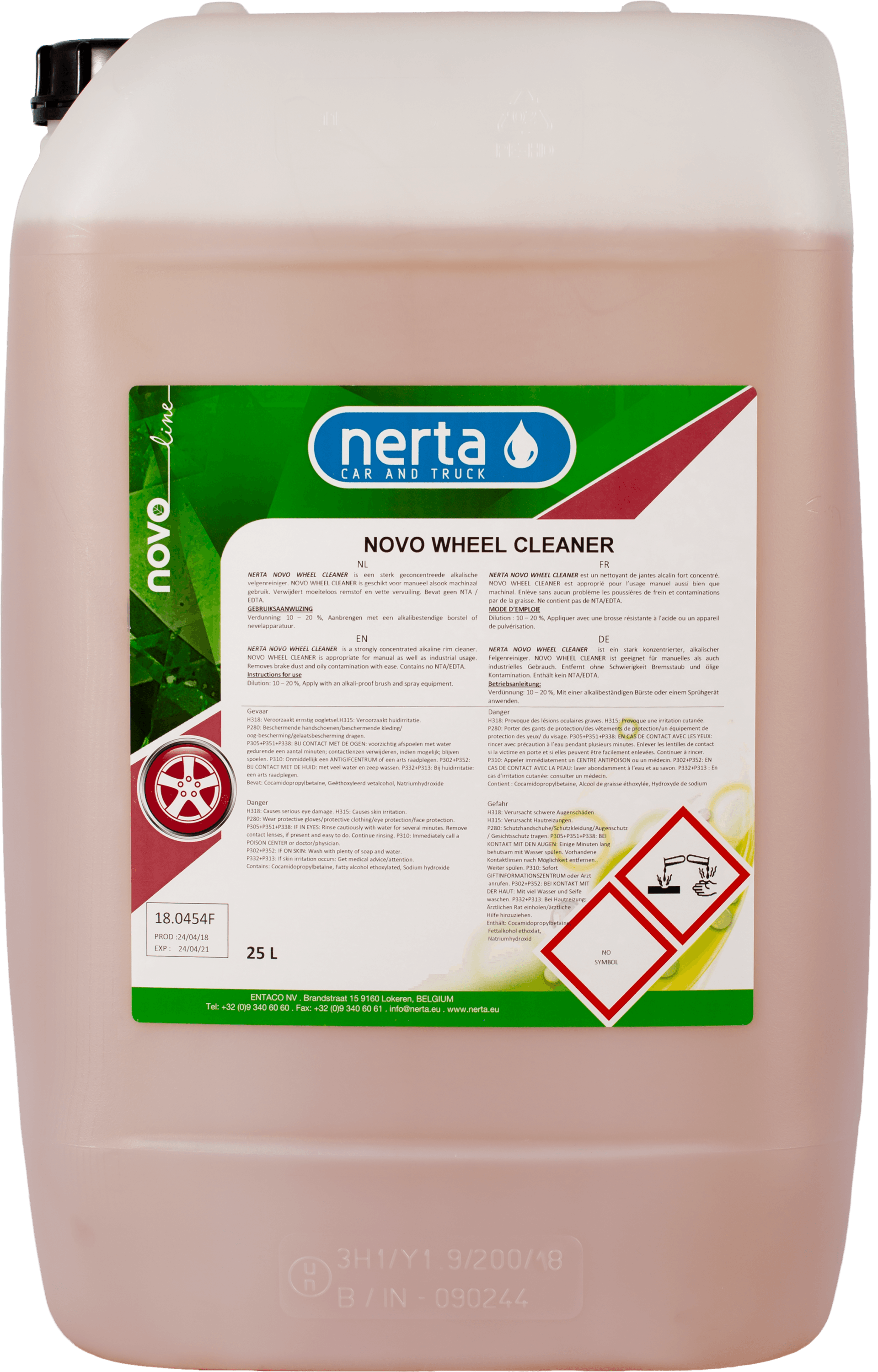 NERTA NOVO WHEEL CLEANER ist ein stark konzentrierter, alkalischer Felgenreiniger. NOVO WHEEL CLEANER ist geeignet für manuelles als auch industrielles Gebrauch. Entfernt ohne Schwierigkeit Bremsstaub und ölige Kontamination. Enthält kein NTA/EDTA.